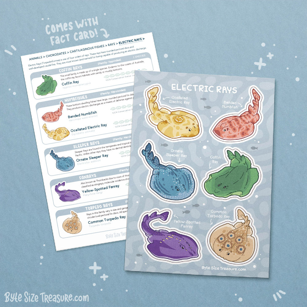Each Electric Rays Sticker Sheet comes with an exclusive fact card, printed on a sturdy 4x6 postcard.