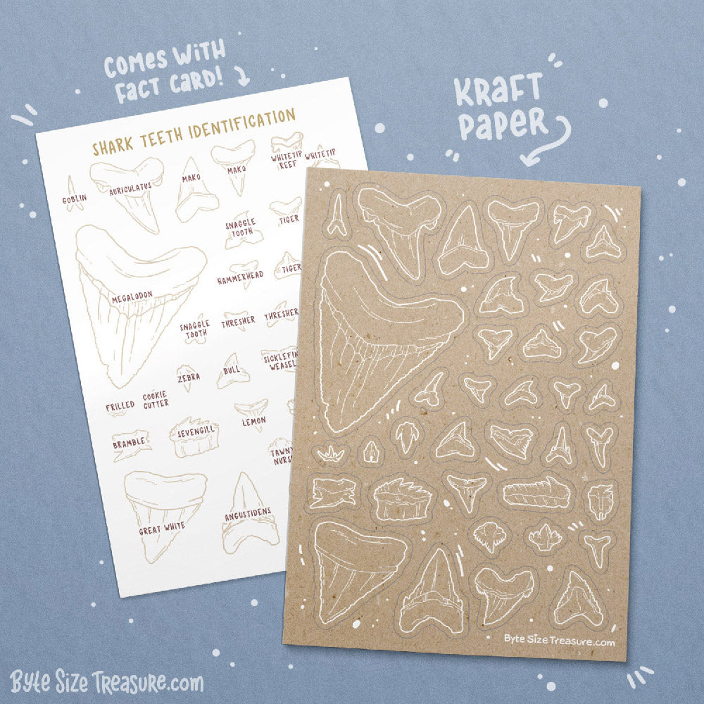 Each Shark Teeth Kraft Sticker Sheet comes with an exclusive fact card, printed on a sturdy 4x6 postcard.