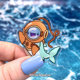 Make a splash with this playful acrylic pin featuring Byte, the shark, dressed in a silly deep sea diver costume.