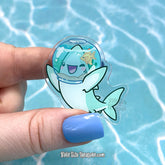 Make a splash with this playful acrylic pin featuring Byte, the shark, dressed in a silly Fish Bowl costume.